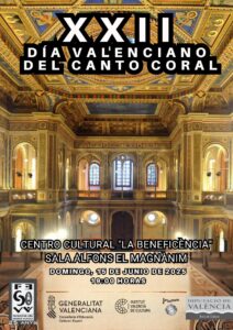 El domingo 15 de Junio a las 19:00 horas, celebraremos en el salón Alfons el Magnànim del Centro Cultural La Beneficència de Valencia el XXII Día Valenciano del Canto Coral con la actuación de la Coral Tutte Voci de Vila-Real, la Serenata Cor de Cambra de Valencia y el Grup Polifónic Cadenza de Dènia, cerrando el acto el Cor Fecocova, que estrenará la obra ganadora del XXII Concurso de Composición «Paco Llácer».